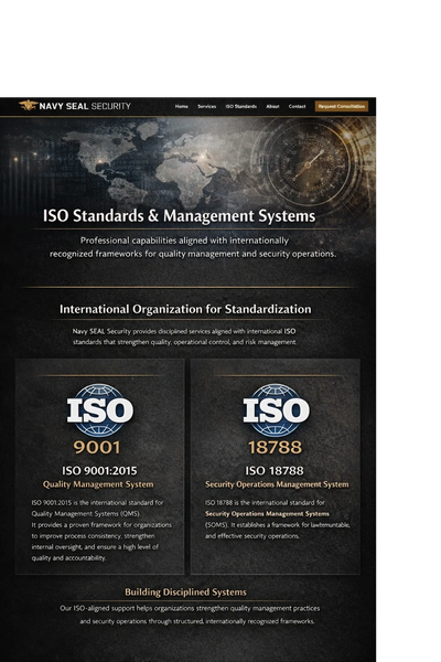 SO 18788 is the international standard for security operations management systems. It was developed for organizations that provide or manage security-related services and establishes a framework for lawful, ethical, accountable, and effective security operations. For clients operating in complex environments, ISO 18788 supports a structured approach to managing risk, oversight, compliance, and operational conduct. It is especially relevant for security providers, risk management firms, protective service organizations, and entities supporting critical infrastructure or high-risk operations. At Navy SEAL Security, ISO 18788-aligned capabilities reflect our commitment to professional security governance, mission readiness, and responsible operational management. Our ISO 18788 capabilities include: Security operations management system design and implementation Risk identification, threat assessment, and mitigation planning Operational policies, procedures, and governance frameworks Oversight, accountability, and compliance support Continuous evaluation and improvement of security operations